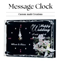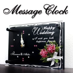 アクリル製の透明感あふれるプレートに高級ブラックプレートを合わせたメッセージ時計にクリスタルビーズが華やかなアメリカンフラワーを添えました。